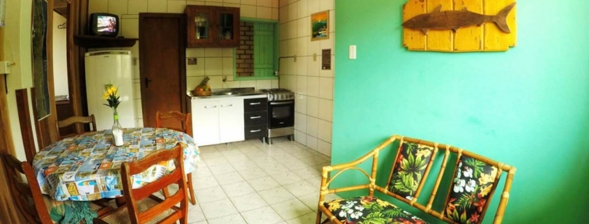Localizado no primeiro andar, com 40m2, dispõe de dois quartos com camas de casal, banheiro, varanda com rede e vista para o mar, cozinha equipada com mesa, fogão, geladeira, pia, micro-ondas, sanduicheira, liquidificador e utensílios (copos, pratos, talheres, xícaras, taças, panelas, etc), tv smart 32', ar condicionado, ventilador e rede wi-fi.